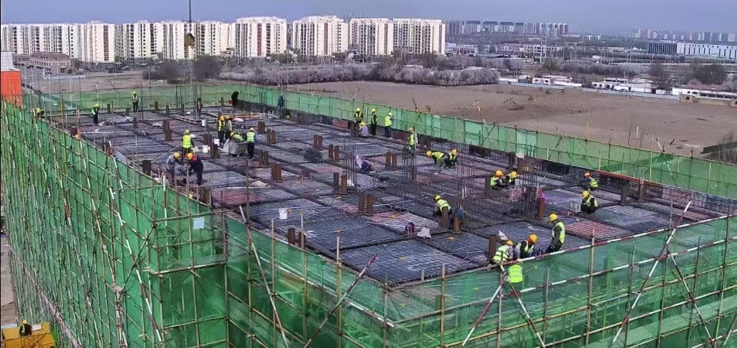 本項目坐落于包頭稀土高新區朝陽路以東,騰飛大街以南,凌云路以北,星輝路以西,總建筑面積8638平方米。其中,綜合樓建筑面積為7126.10平方米,主體為7層框架混凝土結構,建筑全長50.8米、寬33.9米、高23.95米,是本項目最大的核心工程。工程開工建設后,項目部突破綜合樓外觀設計造型復雜、大體積混凝土澆筑技術難度大、施工任務艱巨等難題,采用分段分層穿插作業施工方法,合理緊湊安排關鍵施工工序,嚴格執行“三檢制”,持續加強過程管控,履行“多層級技術交底”,確保項目在保證安全、質量的前提下,實現封頂目標。