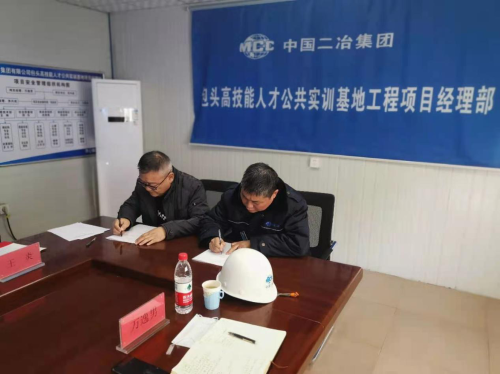 會上,包頭市人社局技能鑒定指導(dǎo)中心主任朝格圖與中國二冶包頭市實訓(xùn)基地項目部項目經(jīng)理萬逸男代表雙方簽訂《安全質(zhì)量責(zé)任書》。