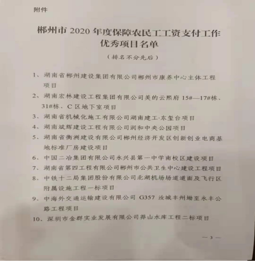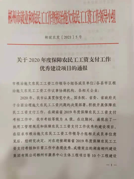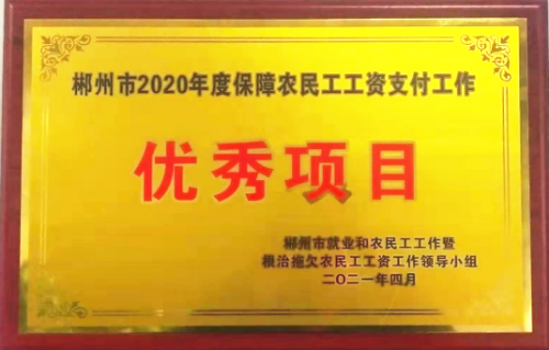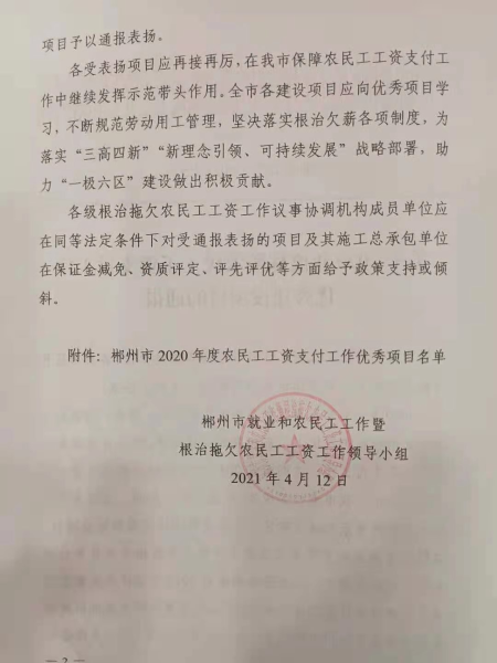 4月14日,中國(guó)二冶鋼構(gòu)分公司湖南永興一中項(xiàng)目獲得2020年度湖南省郴州市保障農(nóng)民工工資支付工作優(yōu)秀建設(shè)項(xiàng)目榮譽(yù)稱號(hào)。