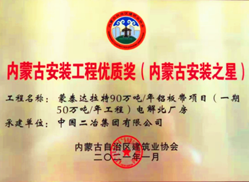 近日,由中國二冶鋼構分公司施工的蒙泰達拉特鋁板帶項目(一期50萬噸電解鋁工程),被內蒙古自治區建筑業協會評選為內蒙古安裝工程優質獎(內蒙古安裝之星)。