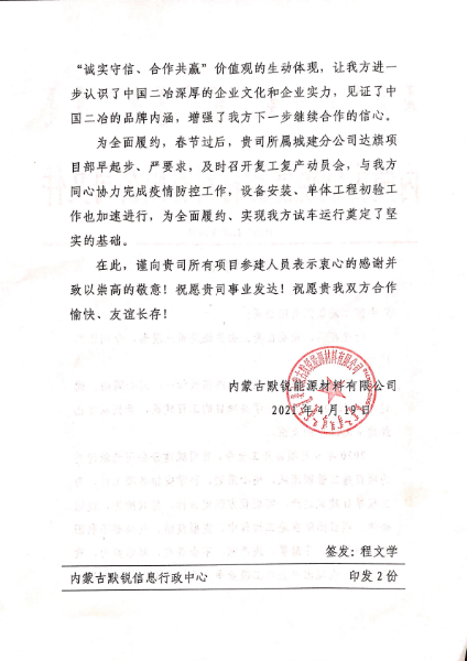 4月19日,內蒙古默銳能源材料有限公司向中國二冶發來感謝信,對在合作過程中所見證的中國二冶作為央企的實力擔當,以及用實際行動踐行的“一天也不耽誤,一天也不懈怠”的企業精神給予高度贊揚;對城建分公司領導給予該工程的高度重視、大力支持表示衷心感謝;對承擔該工程建設任務的達旗項目部全體工作人員以優秀的專業素質和過硬的技術水平,保證項目的順利進行給予充分肯定和高度贊揚。