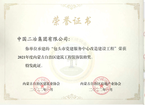 4月11日,中國二冶收到內蒙古自治區建筑協會、內蒙古自治區房地產協會發來的榮譽證書——中國二承建的包頭市黨建服務中心改造項目建設工程榮獲2021年度內蒙古自治區建筑工程裝飾裝修獎。