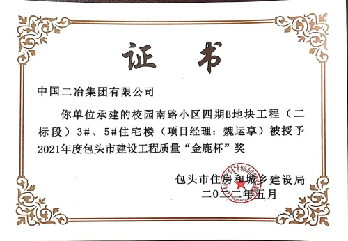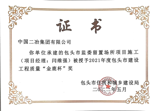 6月1日,中國二冶收到包頭市建筑業(yè)協(xié)會(huì)頒發(fā)的榮譽(yù)證書,中國二冶金力永磁 (包頭)科技有限公司高性能稀土永磁材料基地、包頭市監(jiān)委留置場(chǎng)所、校園南路小區(qū)四期B地塊工程(二標(biāo)段)3#、5#住宅樓三項(xiàng)工程喜獲2021年度包頭市“金鹿杯”工程質(zhì)量獎(jiǎng)。
