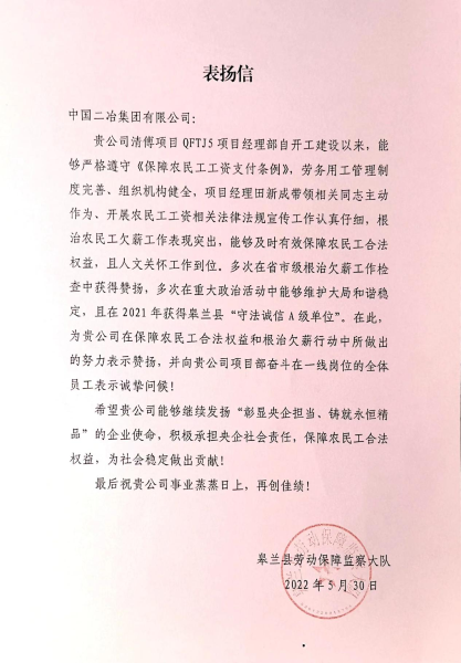 表揚信提出,中國二冶清傅項目部能夠嚴格遵守《保障農民工工資支付條例》,勞務用工管理主動作為、制度完善、組織機構健全,開展農民工工資相關法律法規宣傳工作認真仔細,根治農民工欠薪工作表現突出,能夠及時有效保障農民工合法權益,且人文關懷工作到位。多次在省市級根治欠薪工作檢查中獲得贊揚,多次在重大政治活動中能夠維護大局和諧穩定。