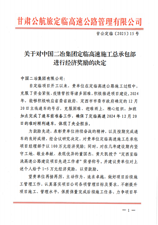 1月18日,中國二冶定臨高速項目收到來自業(yè)主單位甘肅公航旅通定高速公路管理有限公司下發(fā)的《關(guān)于對中國二冶集團定臨高速施工總承包部進行經(jīng)濟獎勵的決定》,對定臨高速施工總承包項目經(jīng)理部予經(jīng)濟獎勵;同時,授予董國杰、黃天凱“定西至臨洮高速公路建設(shè)項目先進工作者”榮譽稱號。
